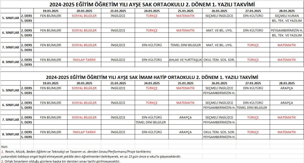 2024-2025 Eğitim-Öğretim Yılı 2.Dönem sınav takvimi aşağıdaki gibidir.